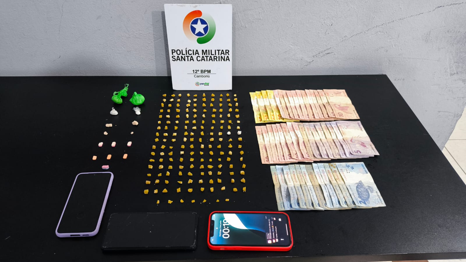 Na madruga deste sábado, 07, a Polícia Militar prendeu uma mulher, de 48 anos, responsável por ponto de venda de drogas no bairro cedros, em Camboriú, além de 4 homens que em eram responsáveis pelo fracionamento e venda das substâncias .