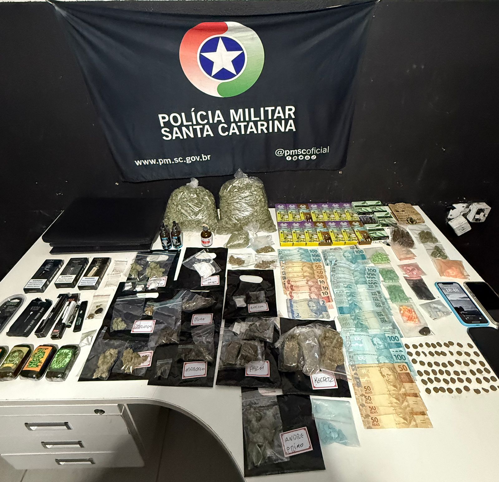 Com base em informações foram localizados dois imóveis em Itajaí, onde foram encontrados 900g de skunk, 500g de haxixe, 330 comprimidos de ecstasy, 58 vapes de THC, 3g de MDMA, notebooks, celulares e mais de R$ 3.000,00 em espécie.