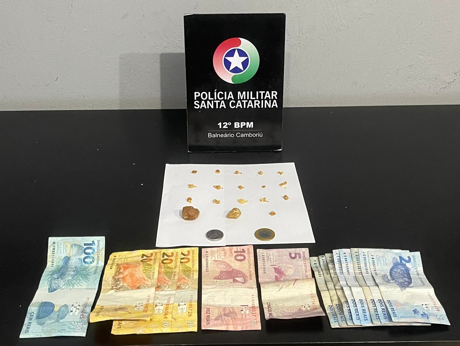 Realizada a abordagem, foi encontrado o valor de R$ 192,50, em notas trocadas, separadas em pequenos grupos e distribuídas em vários bolsos da bermuda que ele usava — característica típica da comercialização de entorpecentes. Com o segundo abordado, de 52 anos, que estaria comprando, foram localizados R$ 16,00 em espécie.