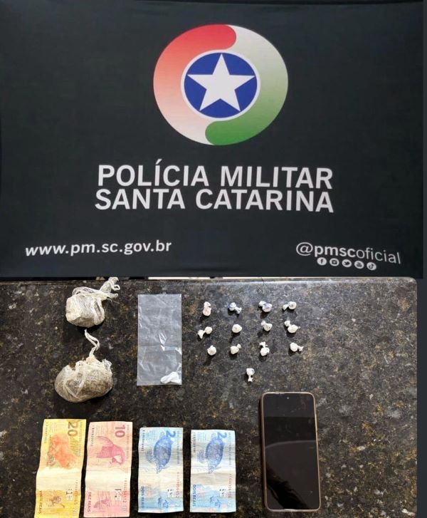 No interior do imóvel, dois homens foram abordados. Diante do nervosismo apresentado e da fundada suspeita, foram realizadas buscas com apoio de outras guarnições. Durante a ação, os policiais apreenderam 14 porções de cocaína, sendo 13 já embaladas e prontas para a venda, 37 gramas de maconha, R$ 34 em dinheiro e um aparelho celular.