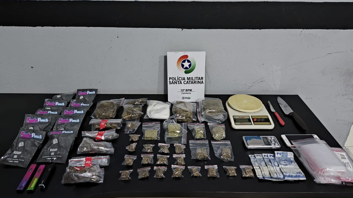 Durante a abordagem, os militares entraram no imóvel, onde encontraram 584 gramas de maconha, 208 gramas de skunk, 127 gramas de cocaína, 13 cigarros eletrônicos de THC, balanças de precisão e materiais usados para fracionamento e embalagem das drogas.