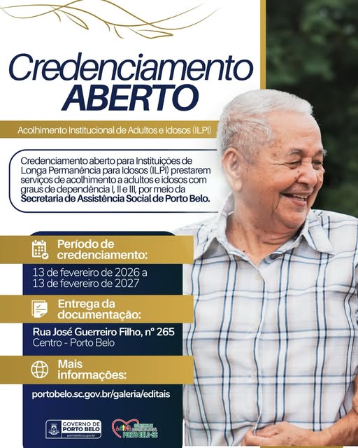 O Prefeitura de Porto Belo, por meio da Secretaria de Assistência Social de Porto Belo, abriu o processo de credenciamento para Instituições de Longa Permanência para Idosos (ILPI) interessadas em prestar serviços de acolhimento institucional a adultos e idosos no município de Porto Belo.