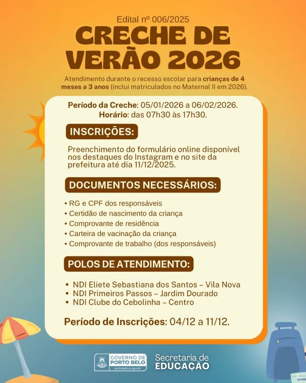 O Governo de Porto Belo abriu nesta quinta-feira (4) as inscrições para a Creche de Verão 2026, programa da Secretaria Municipal de Educação que oferece atendimento durante o recesso escolar para crianças de quatro meses a três anos, incluindo alunos matriculados no Maternal II em 2026. O serviço é destinado exclusivamente a famílias que trabalham em horário comercial e não possuem outra forma de cuidado no período.