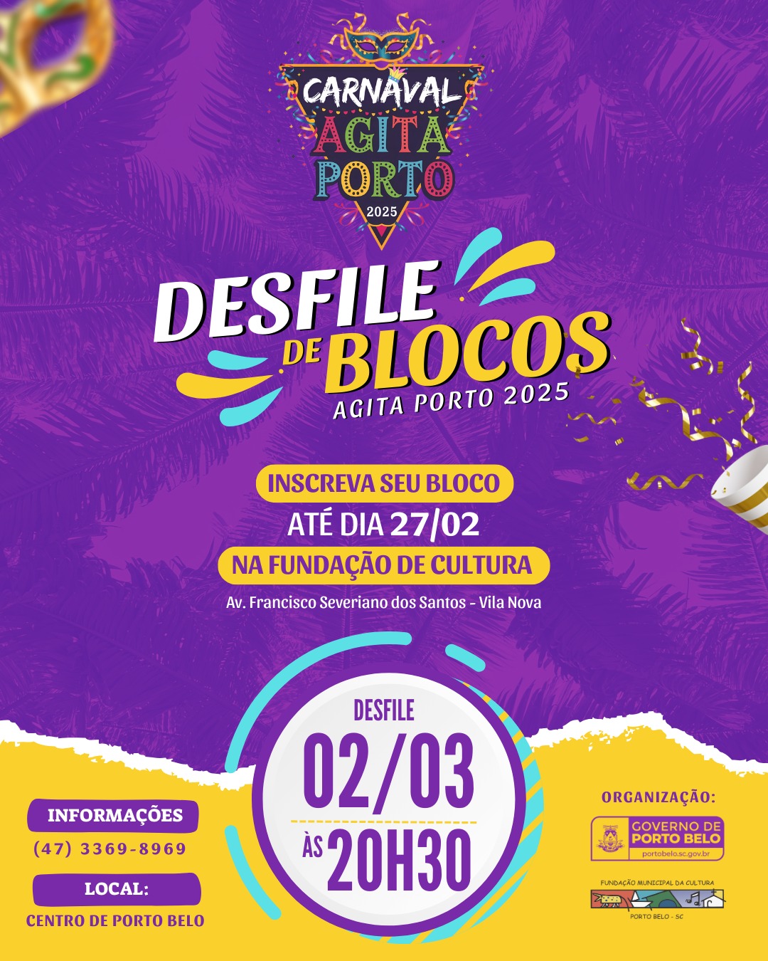 O Governo de Porto Belo, por meio da Fundação Municipal de Cultura, está com inscrições abertas para o Desfile de Blocos, que acontecerá durante o Carnaval Agita Porto 2025. Os blocos interessados devem se inscrever até o dia 27 de fevereiro, na Fundação de Cultura, localizada na Avenida Francisco Severiano dos Santos, no bairro Vila Nova.