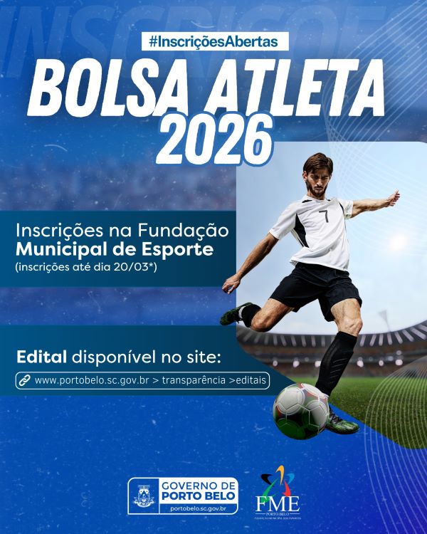 A Prefeitura de Porto Belo, por meio da Fundação Municipal de Esportes, abriu as inscrições para o Programa Bolsa Atleta 2026, iniciativa voltada ao incentivo e apoio a esportistas do município que se destacam em competições. Os interessados podem se inscrever até o dia 20 de março, de forma presencial.