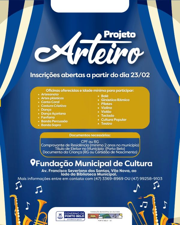 A Prefeitura de Porto Belo, por meio da Fundação Municipal de Cultura, abre na próxima segunda-feira (23) as inscrições para o Projeto Arteiro. A iniciativa garante acesso gratuito a oficinas culturais destinadas a crianças, jovens, adultos e idosos do município.