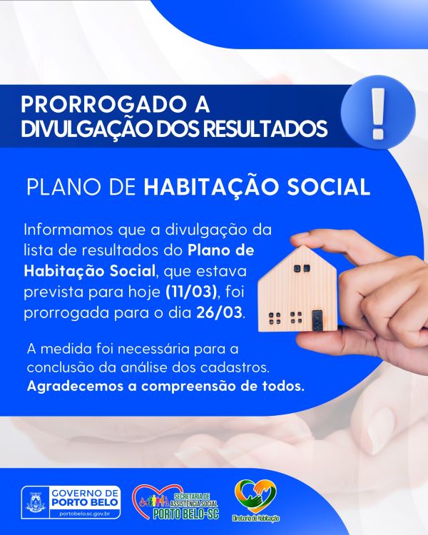 O Governo de Porto Belo anunciou alterações nos prazos do edital de chamamento público do Programa de Habitação de Interesse Social. A mudança ocorre enquanto o município finaliza as obras das dez casas que serão destinadas às famílias contempladas pelo programa.
