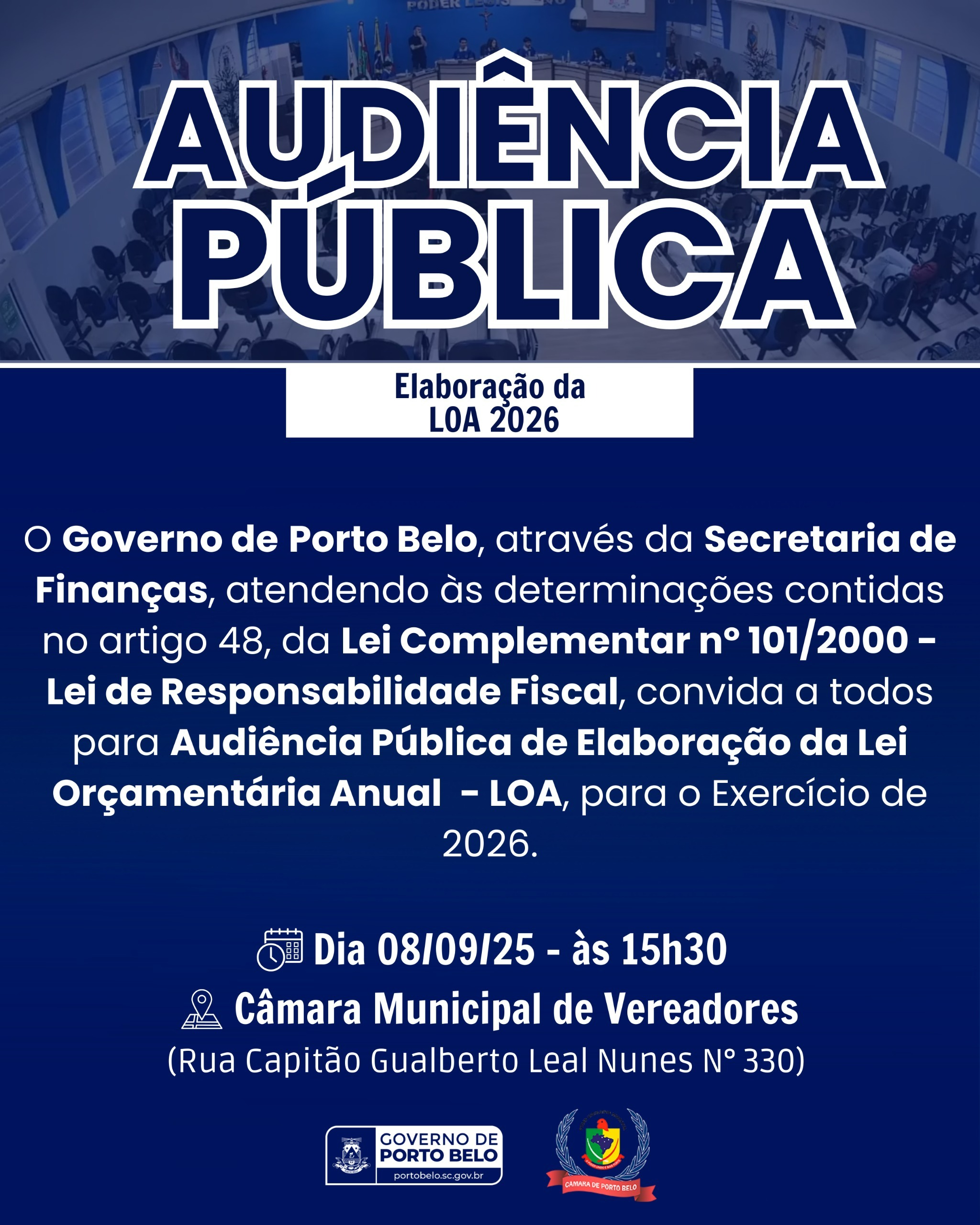 O Governo Municipal de Porto Belo, por meio da Secretaria de Finanças, realizará no dia 8 de setembro de 2025, às 15h30, uma Audiência Pública para discutir a elaboração da Lei Orçamentária Anual (LOA) de 2026. A reunião será aberta ao público e ocorrerá na Câmara Municipal de Vereadores, na Rua Capitão Gualberto Leal Nunes, nº 330.