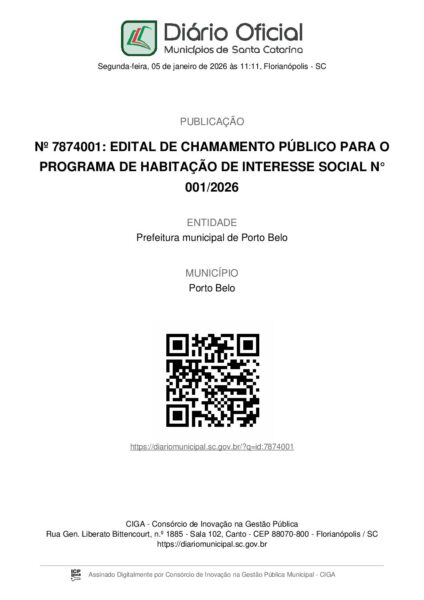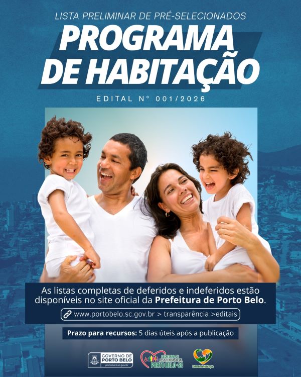 A Prefeitura de Porto Belo divulgou a lista preliminar de pré-selecionados do Programa de Habitação de Interesse Social, referente ao Edital nº 001/2026. A iniciativa é coordenada pela Secretaria Municipal de Assistência Social, em conjunto com o Conselho Municipal de Habitação.