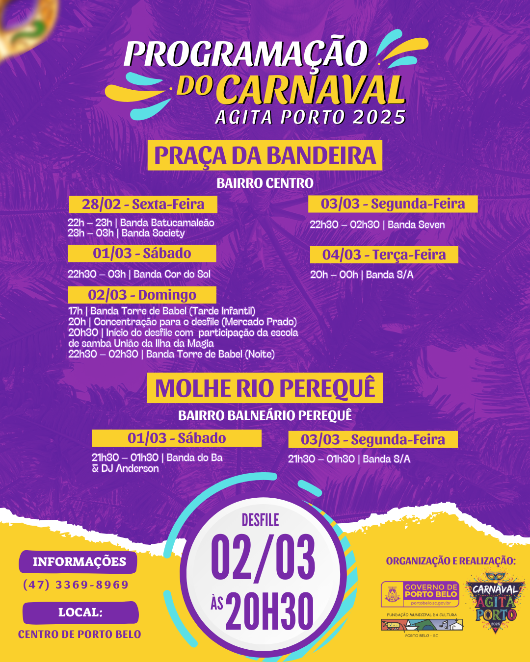 O Governo de Porto Belo, por meio da Fundação Municipal de Cultura, convida moradores, turistas e visitantes para o Carnaval Agita Porto 2025! Este ano, o evento promete agitar a cidade com uma programação especial de cinco dias, repleta de música, animação e muita alegria.