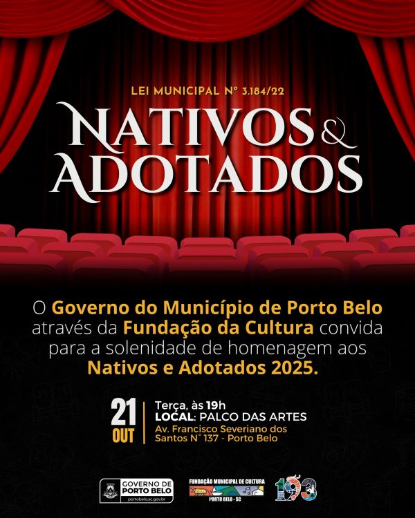 O Governo do Município de Porto Belo, por meio da Fundação Municipal da Cultura, realiza no dia 21 de outubro, às 19h, no Palco das Artes, a tradicional cerimônia Nativos e Adotados 2025, instituída pela Lei Municipal nº 3.184/22.