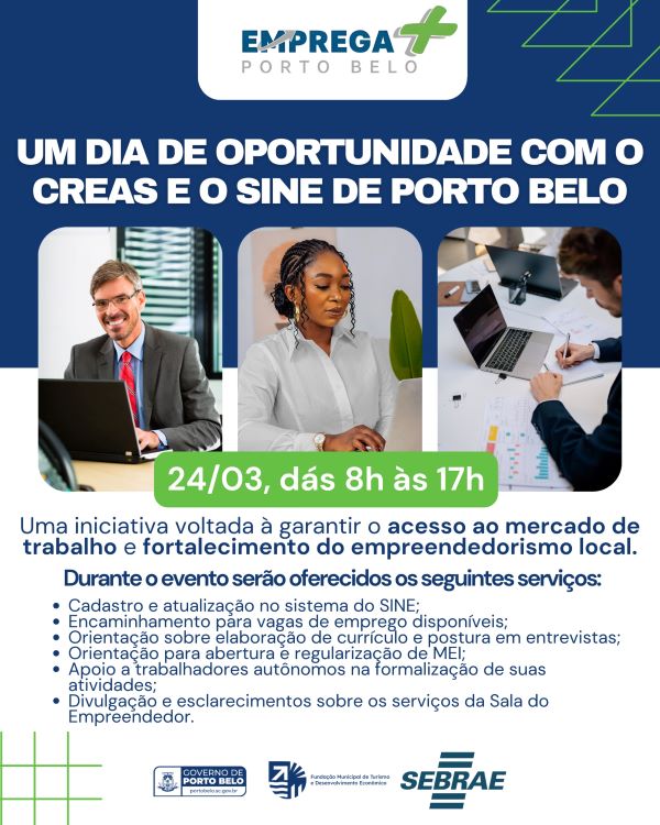 O município de Porto Belo realiza no dia 24 de março, das 8h às 17h, o Dia de Oportunidades, uma ação voltada à geração de emprego e incentivo ao empreendedorismo. O evento é promovido pela Sala do Empreendedor de Porto Belo em parceria com o Centro de Referência Especializado de Assistência Social (CREAS) e o Sistema Nacional de Emprego (SINE).
