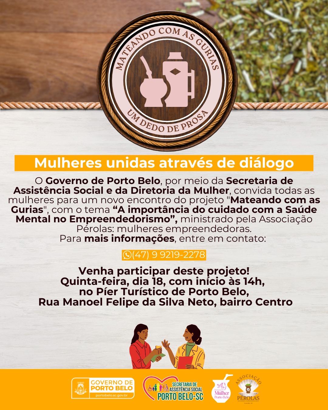 O Governo de Porto Belo, por meio da Secretaria de Assistência Social e da Diretoria da Mulher, realiza nesta quinta-feira (18) mais uma edição do projeto “Mateando com as Gurias”, iniciativa que promove rodas de conversa e fortalecimento feminino.