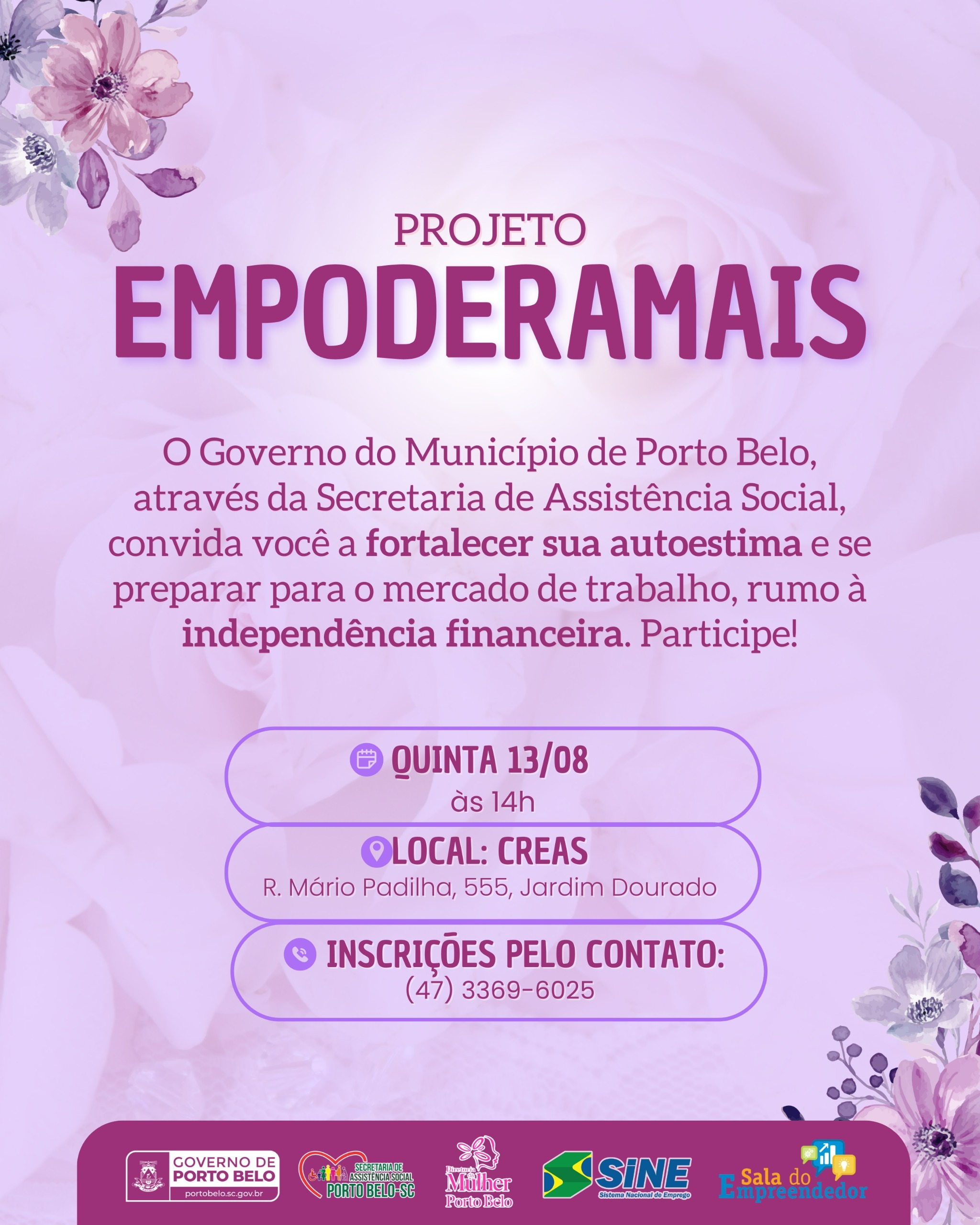 O município de Porto Belo realiza, na próxima quarta-feira (13), mais uma edição do Empoderamais, projeto voltado ao fortalecimento da autoestima, incentivo à autonomia e preparação de mulheres para o mercado de trabalho. A ação é promovida pelo Governo Municipal, por meio da Secretaria de Assistência Social e da Diretoria da Mulher.