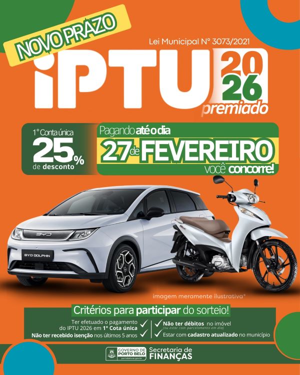 A Prefeitura de Porto Belo prorrogou o prazo para pagamento do IPTU 2026 em cota única com 25% de desconto. A medida foi oficializada por meio do Decreto nº 4.392/2026, publicado nesta segunda-feira (23), que altera o Decreto Municipal nº 4.299/2025.