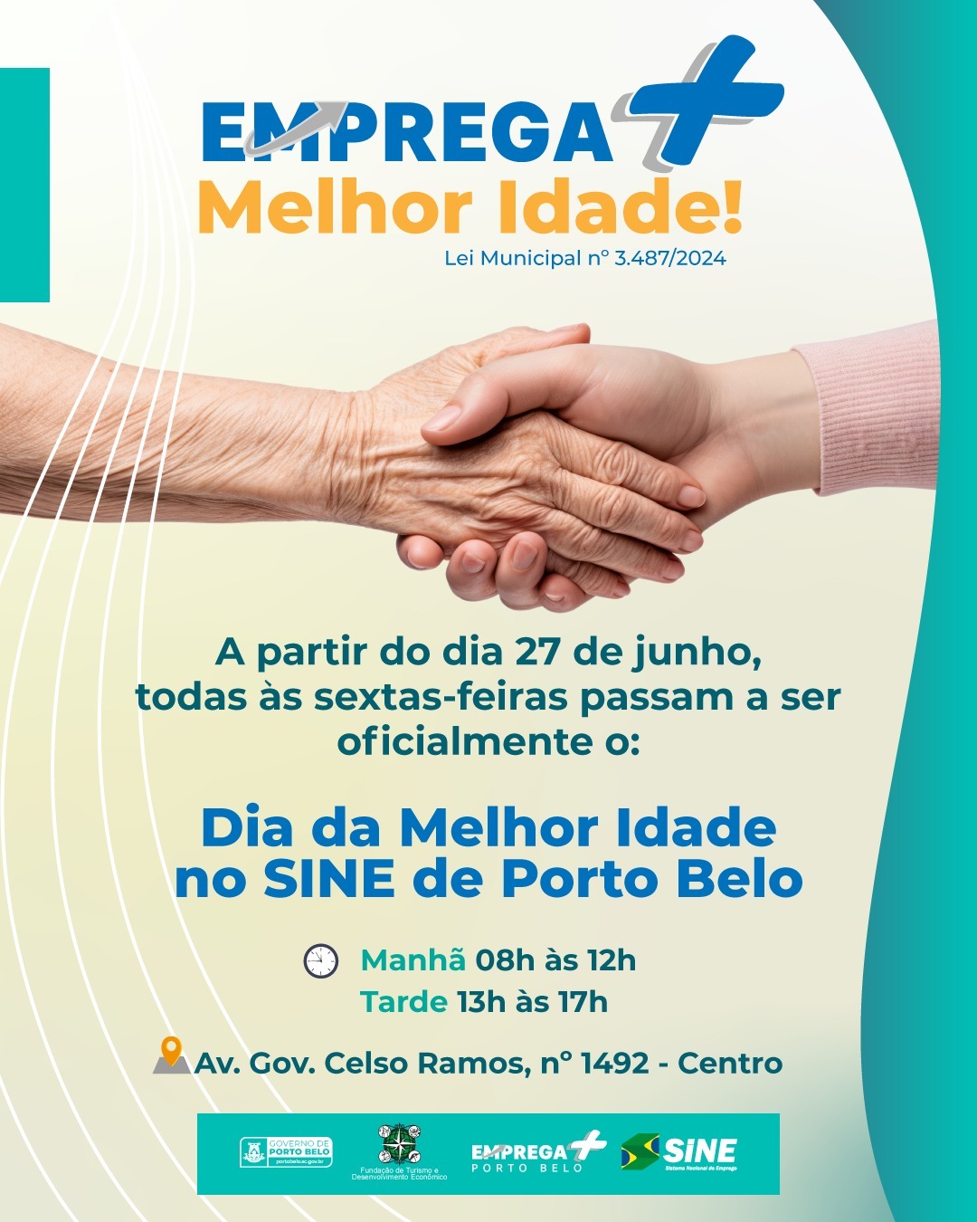 O Governo de Porto Belo, por meio da Fundação Municipal de Turismo e Desenvolvimento Econômico, divulga o Emprega Mais Melhor Idade. A partir do dia 27 de junho, todas às sextas-feiras serão reservadas especialmente para atender idosos acima de 60 anos que buscam uma nova oportunidade no mercado de trabalho.