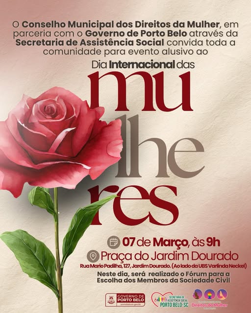 O Conselho Municipal dos Direitos da Mulher de Porto Belo realiza, em parceria com o Governo Municipal, no próximo dia 7 de março, às 9h, o Fórum para a Escolha dos Membros da Sociedade Civil que irão compor o colegiado. O evento acontece na Praça do Jardim Dourado e é aberto ao público.