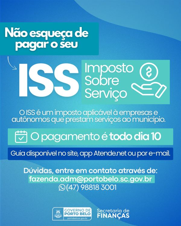 O Governo Municipal de Porto Belo, por meio da Secretaria de Finanças, alerta contribuintes sobre a importância do pagamento do Imposto Sobre Serviços (ISS), regulamentado pela Lei Municipal nº 2144/2014. O tributo é devido por empresas e profissionais autônomos que atuam na prestação de serviços no município.