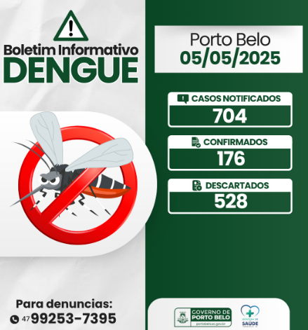 O Governo do Município de Porto Belo, por meio da Secretaria de Saúde e Vigilância Epidemiológica, divulga o boletim informativo da dengue. Atualmente, há 176 casos confirmados de dengue. Apenas neste ano, já foram notificados 704 casos, sendo 528 destes descartados.