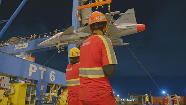 Vindo diretamente de Norrköping, na Suécia, o 10º caça F-39 Gripen da Força Aérea Brasileira (FAB), de matrícula FAB 4110, levou 21 dias para chegar em Navegantes, cidade de Santa Catarina, onde está localizada a Portonave, terminal portuário privado que realizou a operação de descarga da aeronave. O navio Fagelgracht, do armador Spliethoff, atracou nesta quinta-feira (12). A excelência operacional e os investimentos constantes em segurança da Companhia são essenciais para o recebimento do caça. Além disso, a proximidade com o Aeroporto Internacional de Navegantes é um fator estratégico, assim como a Avenida Portuária, que facilita o transporte terrestre da aeronave até o aeroporto.