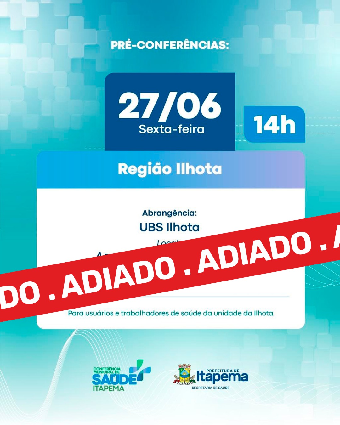 A Secretaria Municipal de Saúde informa que, devido às condições climáticas, a Pré-Conferência da Saúde prevista para esta sexta-feira (27), na Região Ilhota, foi adiada.