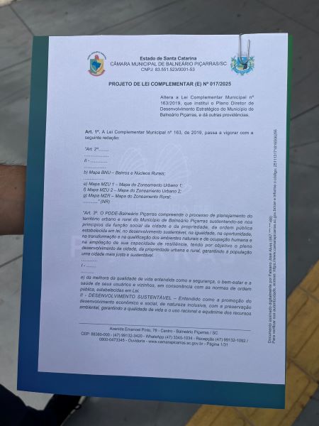 A Prefeitura de Balneário Piçarras, por meio da Procuradoria Geral, protocolou nesta quinta-feira (13/11), na Câmara de Vereadores, o Projeto de Lei Complementar nº 17/2025, que dispõe sobre os ajustes do Plano Diretor. O projeto foi amplamente discutido com a comunidade por meio de audiências públicas realizadas ao longo do ano, garantido a participação popular e elaboração do projeto de forma democrática e transparente.