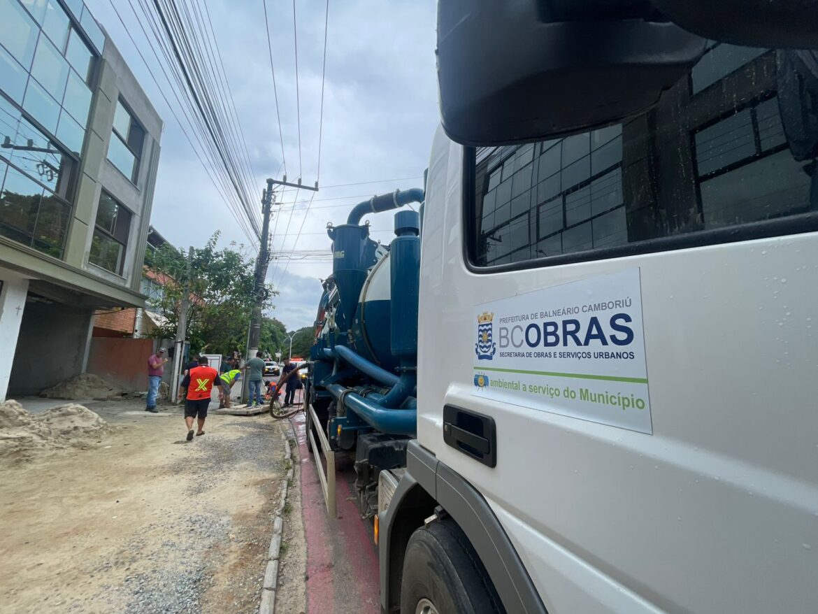 A Prefeitura de Balneário Camboriú, por meio da Secretaria de Obras, realizou neste sábado (1º) uma ação emergencial de limpeza no sistema de drenagem pluvial da Avenida Ruy Barbosa, no trecho entre a Rua Clarice Lispector e a Avenida Carlos Drummond de Andrade, na Praia dos Amores.