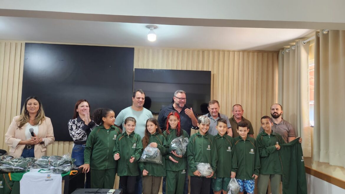 O kit, composto por jaqueta, calça comprida, bermuda e camiseta, já está sendo distribuído nas escolas do município. A Escola Básica Municipal João Vergílio Pereira, situada no Cedro, foi o palco da entrega simbólica, conduzida pelo prefeito Elcio Rogerio Kuhnen para uma turma entusiasmada. No auditório da escola, os estudantes interagiram com o prefeito, num momento de descontração. Além do prefeito, a entrega contou com a presença dos vereadores Alexandre Silveira e Amilton Bianchet, do secretário de agricultura Mário Bianchet e da Secretária de Educação, Roseli Poltronieri.