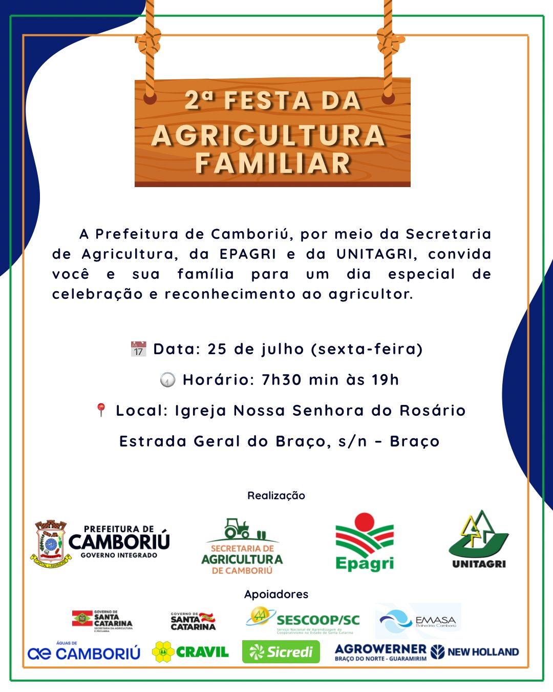 A Prefeitura de Camboriú, por meio da Secretaria de Agricultura, convida os veículos de comunicação para a cobertura da 2ª Festa da Agricultura Familiar, que será realizada no dia 25 de julho (sexta-feira), na comunidade do Braço. O evento tem como objetivo valorizar e reconhecer o trabalho dos agricultores locais, promovendo integração com a comunidade por meio de atrações culturais, gastronomia e atividades diversas ao longo do dia.