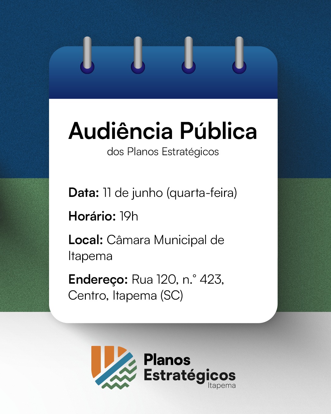 A Prefeitura de Itapema convida toda a população para participar dos primeiros eventos públicos dos Planos Estratégicos do município. No dia 11 de junho (quarta-feira), às 19h, os Planos serão apresentados em Audiência Pública na Câmara Municipal (R. 120, n.º 423, Centro). No dia seguinte (12), às 17, acontecerá a Oficina Comunitária do Plano de Ação Climática na sala de reuniões do Departamento de Compras na Sede da Prefeitura (Av. Nereu Ramos, n.º 134, Centro).