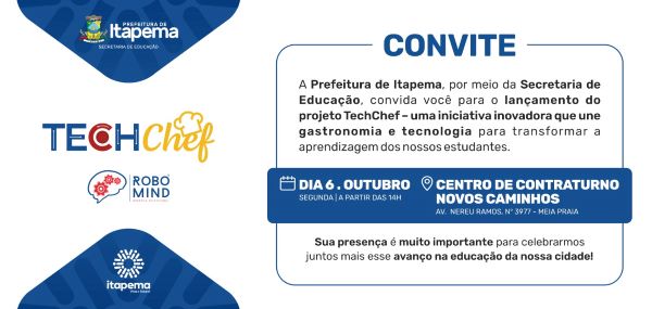 A Prefeitura de Itapema, por meio da Secretaria de Educação, realiza na próxima segunda-feira (06/10), às 14h, o lançamento oficial do projeto TechChef, no Centro de Contraturno Novos Caminhos, na Meia Praia. O evento contará com a presença de autoridades, professores e estudantes da rede municipal.