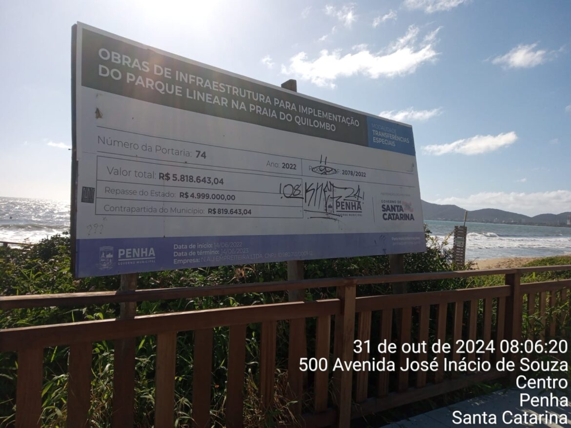 O Governo Municipal de Penha lamenta os atos de vandalismo registrados na obra do Parque Linear, entre as Praias do Quilombo, Pedrinha e Armação, nesta quarta-feira (30). A Prefeitura pede a colaboração de toda a população, visitantes e turistas, para manter os patrimônios e espaços públicos do município conservados.