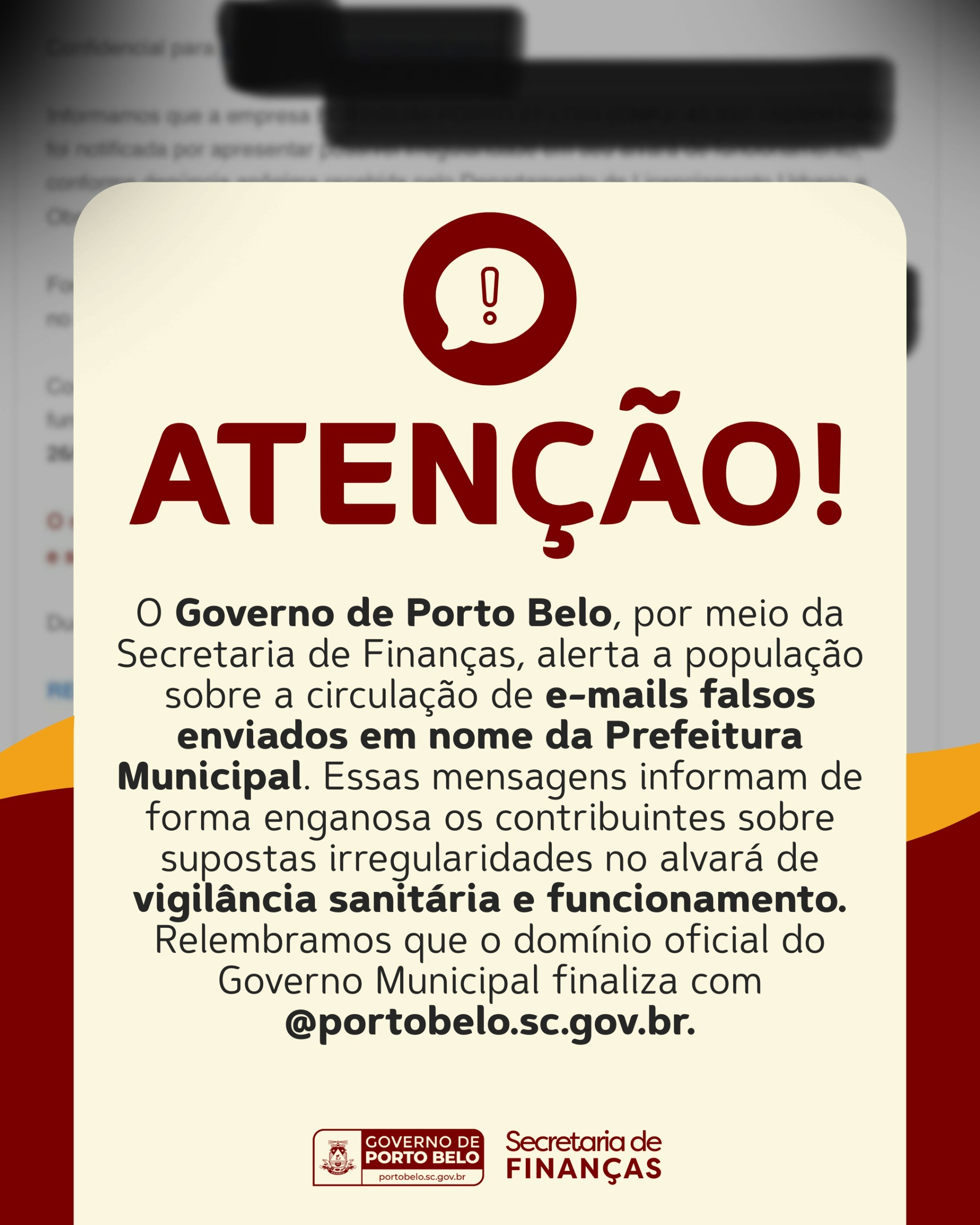 O Governo de Porto Belo, por meio da Secretaria de Finanças, emitiu nesta semana um alerta à população sobre a circulação de e-mails falsos enviados em nome da Prefeitura. As mensagens fraudulentas informam, de maneira enganosa, supostas irregularidades relacionadas ao alvará de vigilância sanitária e funcionamento.