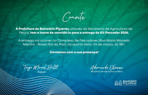 A Prefeitura de Balneário Piçarras, por meio da Secretaria de Agricultura e Pesca, realiza a entrega do Kit do Pescador nesta quarta-feira-feira (04/03), às 18h, no Complexo de Apoio ao Pescador Artesanal, junto à Colônia Z26. Os kits são compostos por equipamentos de uso diário dos pescadores, para uso no mar e para a manutenção das embarcações.