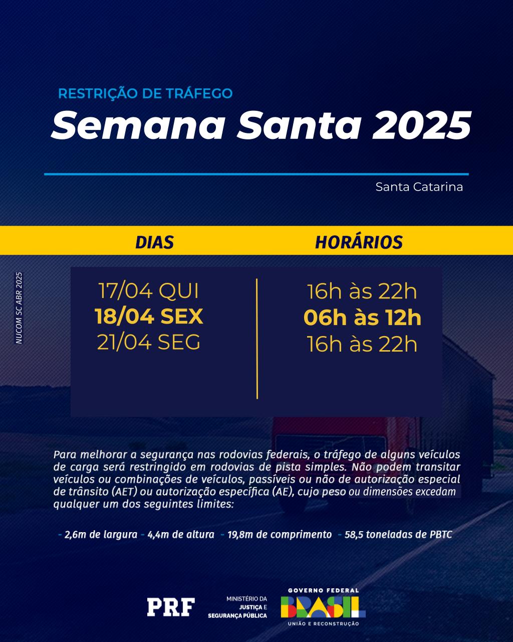 RESTRIÇÃO DE TRÁFEGO – Para aumentar a fluidez do trânsito e diminuir o risco de acidentes, haverá restrição de tráfego para veículos de cargas excedentes, ou seja, que ultrapassam as dimensões máximas permitidas e que precisam de AET (Autorização Especial de Trânsito), apenas em pistas simples, nos seguintes dias e horários: