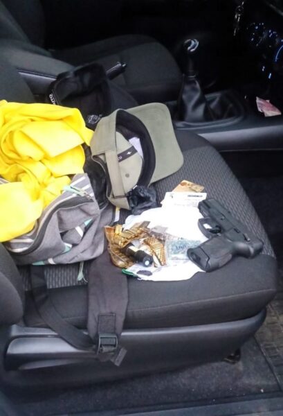Durante a abordagem, realizada com apoio da Polícia Militar, os PRFs constataram que o passageiro utilizava um colete balístico e carregava na cintura uma pistola calibre 9mm carregada com 12 munições, pronta para uso e com numeração raspada. Dentro do veículo, além do armamento, os agentes encontraram uma touca do tipo balaclava, cinco relógios, joias, celulares, pedras semipreciosas e documentos das vítimas.
