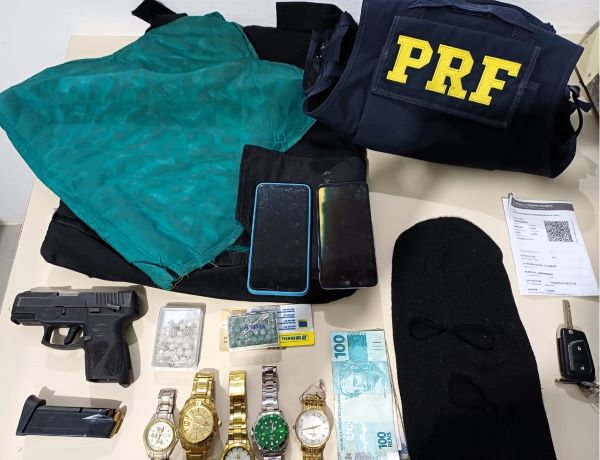 Durante a abordagem, realizada com apoio da Polícia Militar, os PRFs constataram que o passageiro utilizava um colete balístico e carregava na cintura uma pistola calibre 9mm carregada com 12 munições, pronta para uso e com numeração raspada. Dentro do veículo, além do armamento, os agentes encontraram uma touca do tipo balaclava, cinco relógios, joias, celulares, pedras semipreciosas e documentos das vítimas.