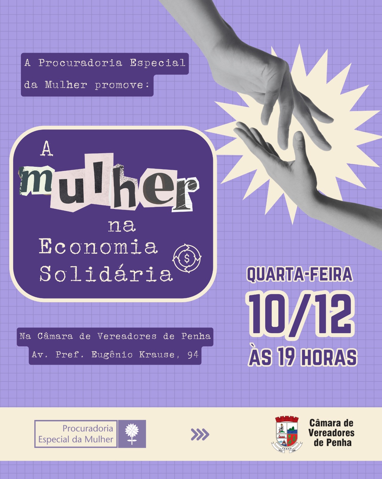 A Procuradoria Especial da Mulher da Câmara de Vereadores de Penha realiza, na próxima quarta-feira, 10 de dezembro, às 19h, o evento “A Mulher na Economia Solidária”, marco oficial da retomada dos trabalhos do órgão no município. A atividade será aberta ao público e reunirá representantes do poder público, lideranças comunitárias, entidades ligadas ao empreendedorismo feminino e mulheres envolvidas em iniciativas de economia solidária.