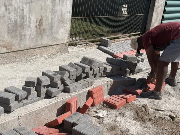 No Centro, a Rua 129C recebe serviço de recomposição de pavimentação em lajotas, assegurando melhores condições de tráfego e conservação da via.