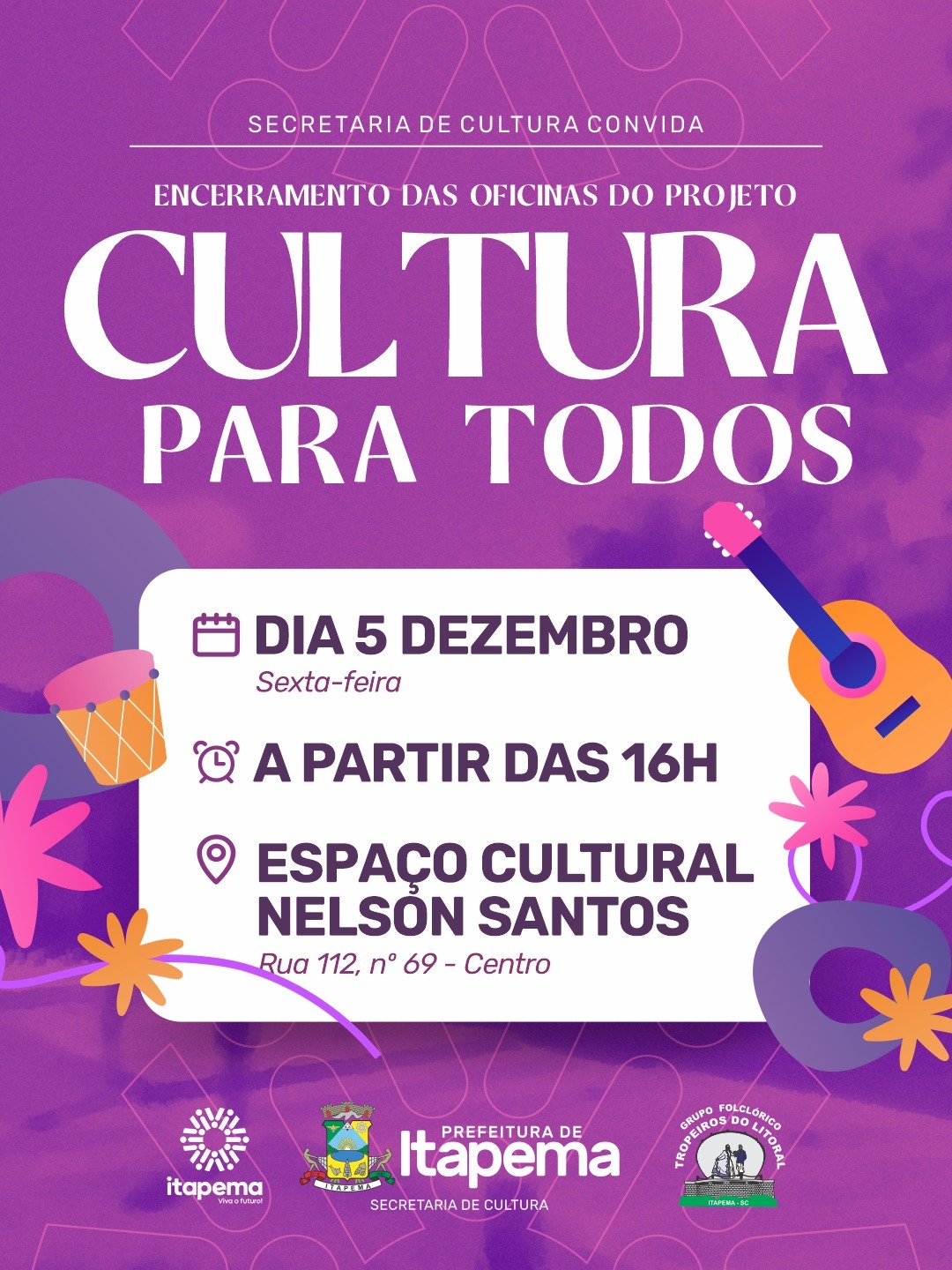 O Projeto Cultura para Todos 2025 encerra suas atividades nesta sexta-feira (05/12) com um grande encontro cultural promovido pela Prefeitura de Itapema, por meio da Secretaria de Cultura, no Espaço Cultural Nelson Santos (Rua 112, nº 69 – Centro). Coordenado pelo Grupo Folclórico Tropeiros do Litoral, o evento começa às 16h e convida toda a comunidade a prestigiar apresentações gratuitas que refletem o trabalho artístico desenvolvido ao longo do ano.