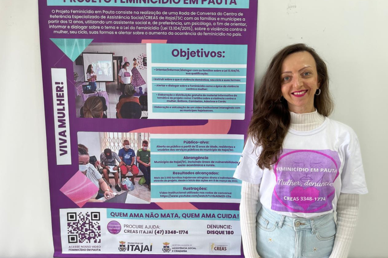 Entre as iniciativas selecionadas estava o Projeto Feminicídio em Pauta, desenvolvido pelo Centro de Referência Especializado de Assistência Social (CREAS) da Secretaria de Assistência Social e Cidadania (SASC) de Itajaí. Criado em 2021, o projeto promove rodas de conversa com famílias atendidas pelas políticas públicas, e aborda temas como a Lei do Feminicídio (Lei 13.104/15), o ciclo da violência doméstica, sinais de relacionamentos abusivos e estratégias de prevenção. Além dos encontros reflexivos, a ação utiliza materiais de apoio como vídeo institucional, cartilha informativa, camisetas, adesivos, bottons e cards digitais, e fortalece a prevenção e o diálogo na comunidade.