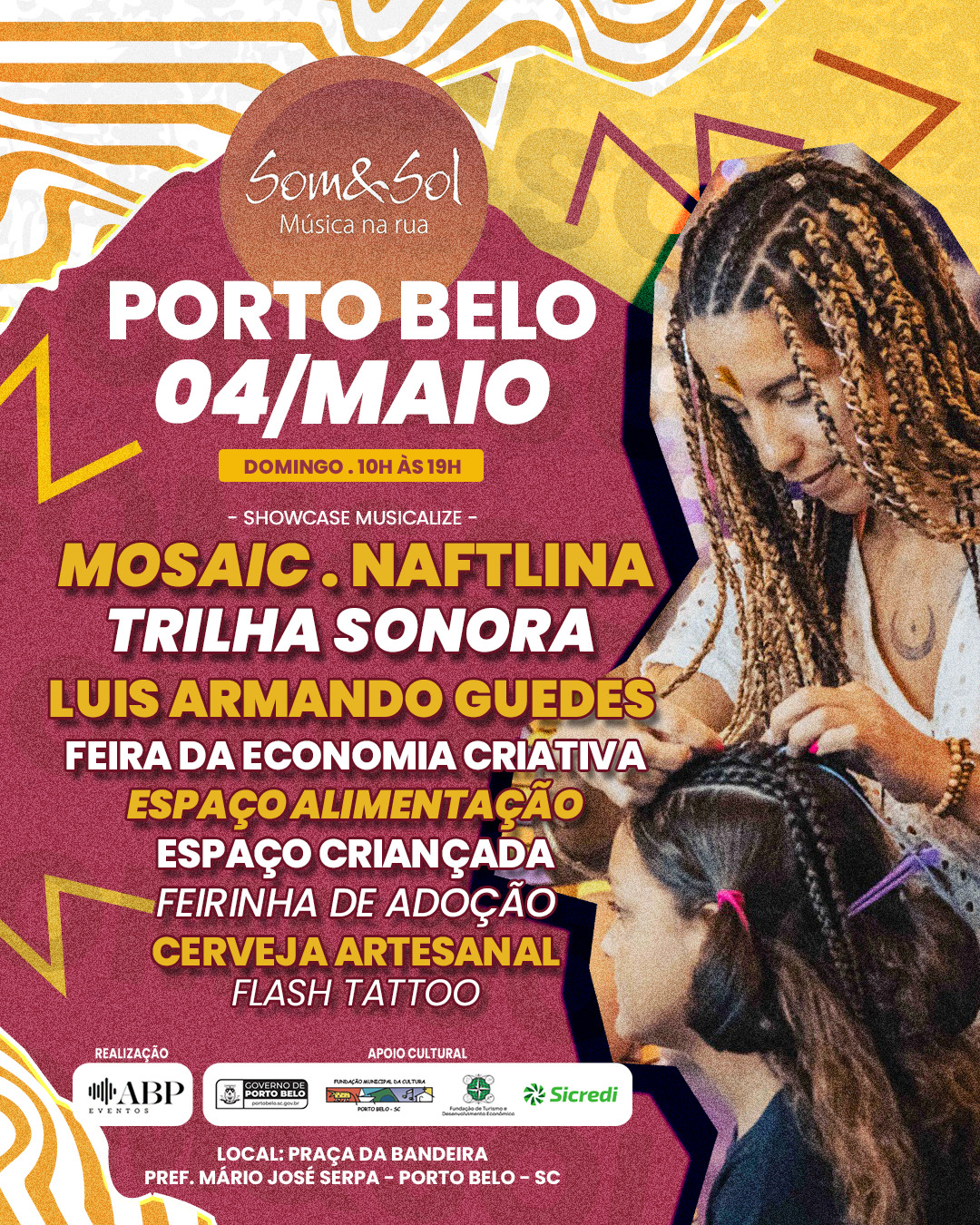 O Som&Sol – Música na Rua é realizado pela ABP Eventos com apoio da Prefeitura de Porto Belo, através da Fundação Municipal de Cultura e da Fundação Municipal de Turismo, e do Sicredi.