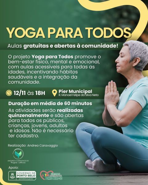 O Governo de Porto Belo, por meio da Secretaria de Assistência Social, realizará o projeto “Yoga para Todos”, que tem como objetivo promover o bem-estar físico, mental e emocional da comunidade. A iniciativa, conduzida pela instrutora Andrea Caravaggio, oferece aulas gratuitas e abertas ao público, incentivando hábitos saudáveis e a integração entre pessoas de todas as idades.