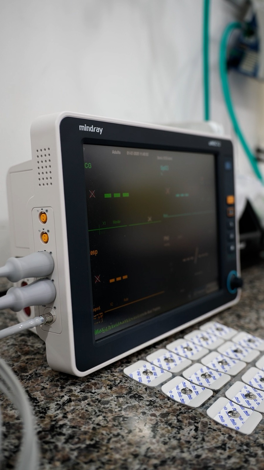 Enquanto o ventilador mecânico auxilia pacientes com insuficiência respiratória, o monitor mede simultaneamente diferentes parâmetros de um paciente, como frequência cardíaca, pressão arterial, saturação de oxigênio, frequência respiratória e temperatura corporal.