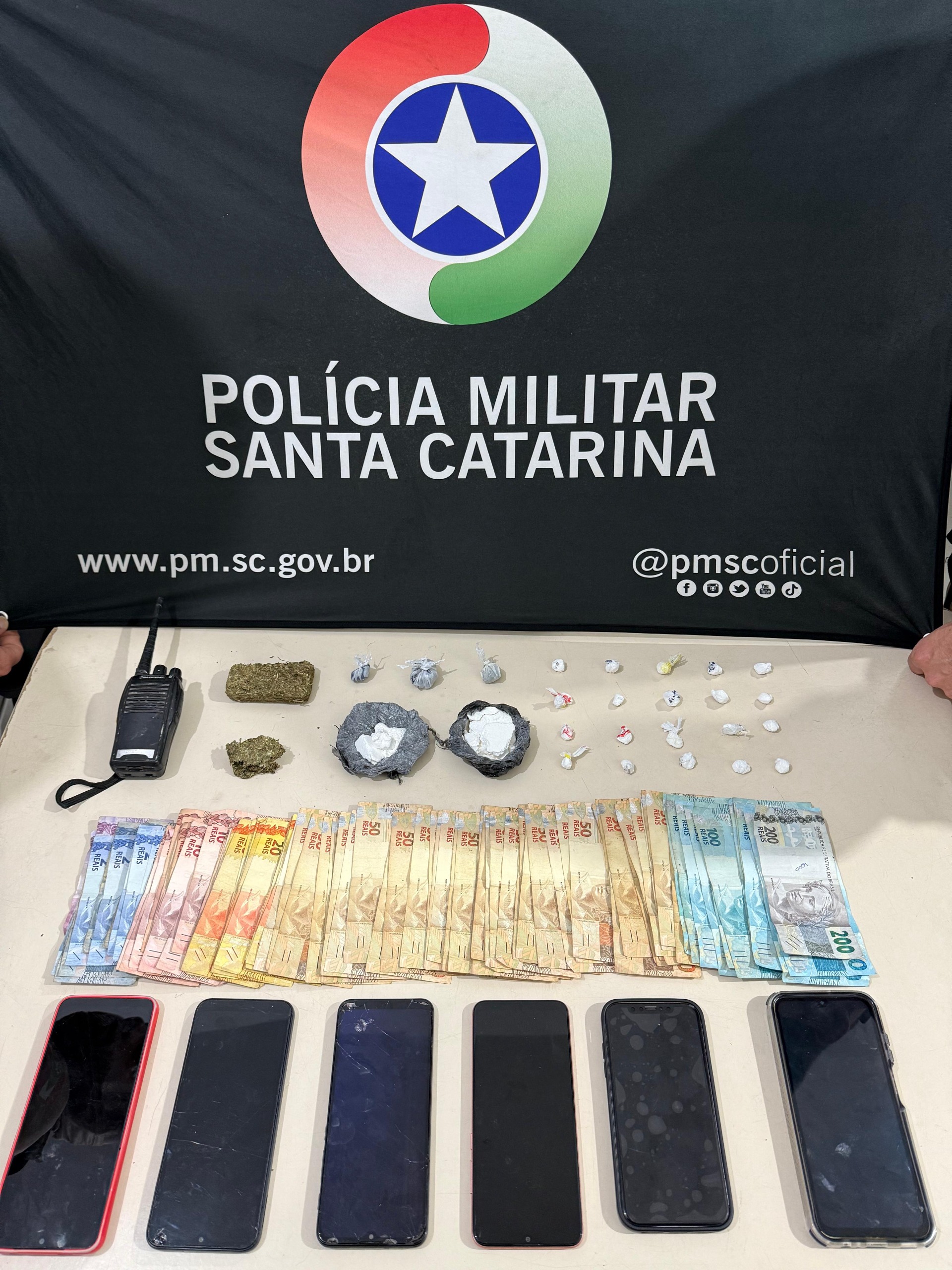 Na noite deste sábado (13), uma operação da Polícia Militar resultou na prisão de quatro pessoas e na apreensão de drogas, dinheiro e aparelhos celulares, no bairro Perequê, em Porto Belo.