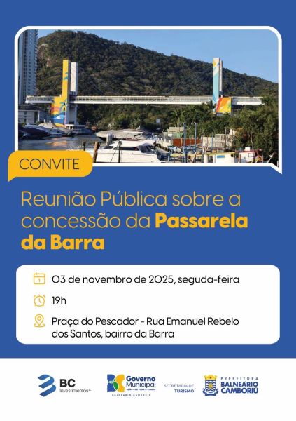 Acontece na noite desta segunda-feira (3) uma reunião pública para discutir e apresentar à comunidade local as fases do processo de concessão da Passarela Manoel Firmino da Rocha – a Passarela da Barra. O encontro, organizado pela BC Investimentos S/A, em parceria com a Prefeitura de Balneário Camboriú, será às 19h, na Praça do Pescador.