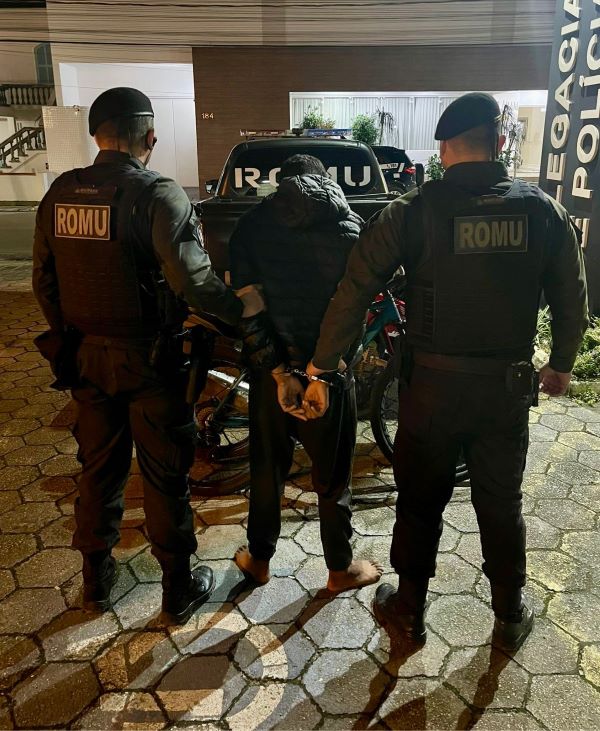 A ocorrência teve início após a Polícia Militar ser acionada via Central de Emergência para atender um roubo registrado na Avenida Nereu Ramos, nas proximidades da Rua 253. No local, a vítima relatou ter sido surpreendida por quatro homens vestidos de preto, que o agrediram e fugiram levando sua bicicleta azul e um celular.