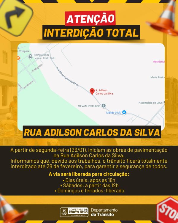 A Rua Adilson Carlos da Silva, em Porto Belo, terá interdição total do tráfego de veículos a partir de segunda-feira (26) para a execução de obras de pavimentação. A informação foi divulgada pelo Governo Municipal, por meio do Departamento de Trânsito, e a previsão é de que os trabalhos se estendam até o dia 28 de fevereiro.