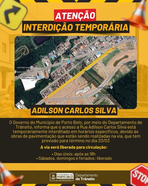 Motoristas que circulam por Porto Belo devem ficar atentos às mudanças no trânsito. O acesso à Rua Adilson Carlos Silva está temporariamente interditado em horários específicos devido às obras de pavimentação realizadas pelo Governo Municipal, por meio do Departamento de Trânsito. A previsão é de que os trabalhos sejam concluídos até o dia 20 de março.
