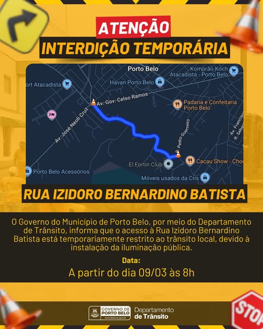 Motoristas que circulam por Porto Belo devem ficar atentos a mudanças no trânsito. A Rua Izidoro Bernardino Batista terá trânsito restrito apenas para moradores a partir desta segunda-feira, 9 de março, às 8h, devido aos serviços de instalação de iluminação pública realizados pelo Governo Municipal, por meio do Departamento de Trânsito.